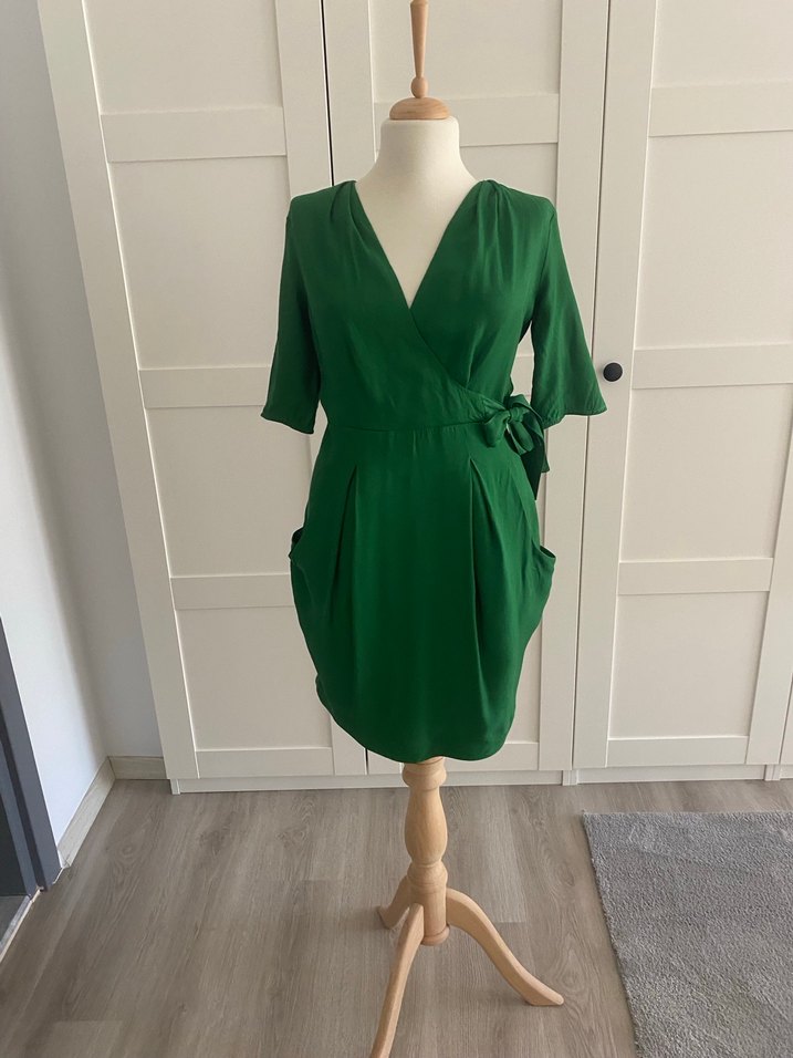Koyu yeşil midi elbise, V yaka, kısa kollu İpek gibi kumaştan, bol kesim, romantik akşamlar için bohem Paris tarzı.