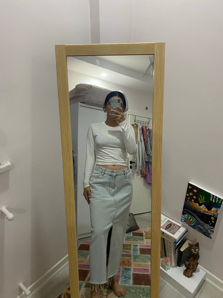 midi yırtmaçlı denim etek