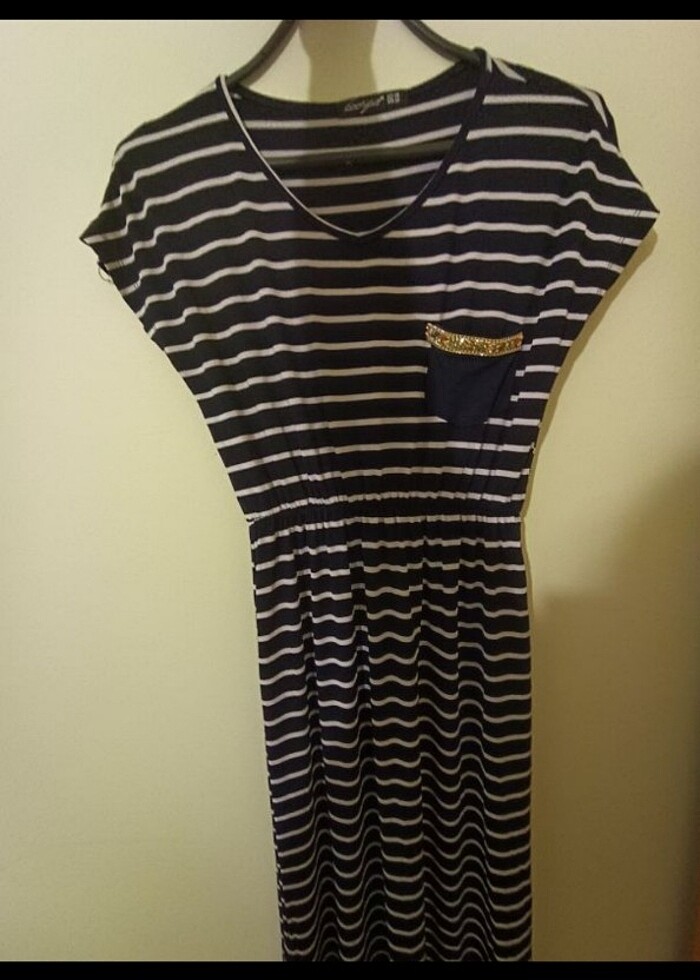 Ürünü 4 kez giydim, çok iyi durumda. Yanlardan yırtmaçlı, önünde işlemeli v yaka bir elbise. Vücudu saran bir kumaşı var.