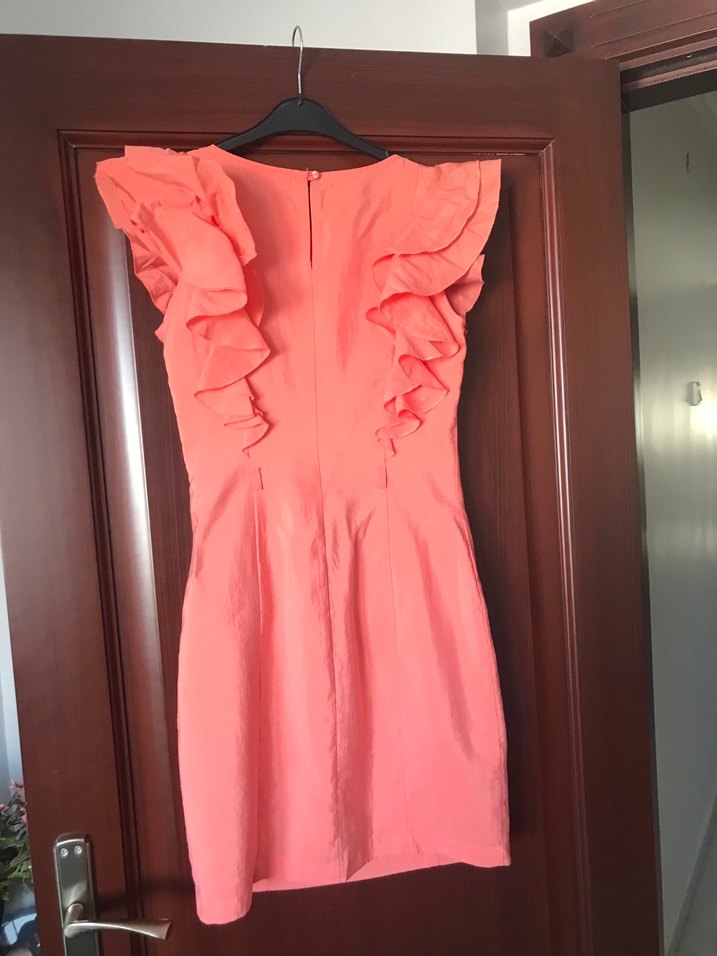 Yuvarlak yakalı ve kolsuz bu midi abiye elbise, omuzlardaki fırfır detaylarıyla dikkat çeker. Parlak ve desensiz kumaşıyla özel günler için uygundur. Astarlıg boy 88 cm iki kol arası 40 cm bel 35 cm