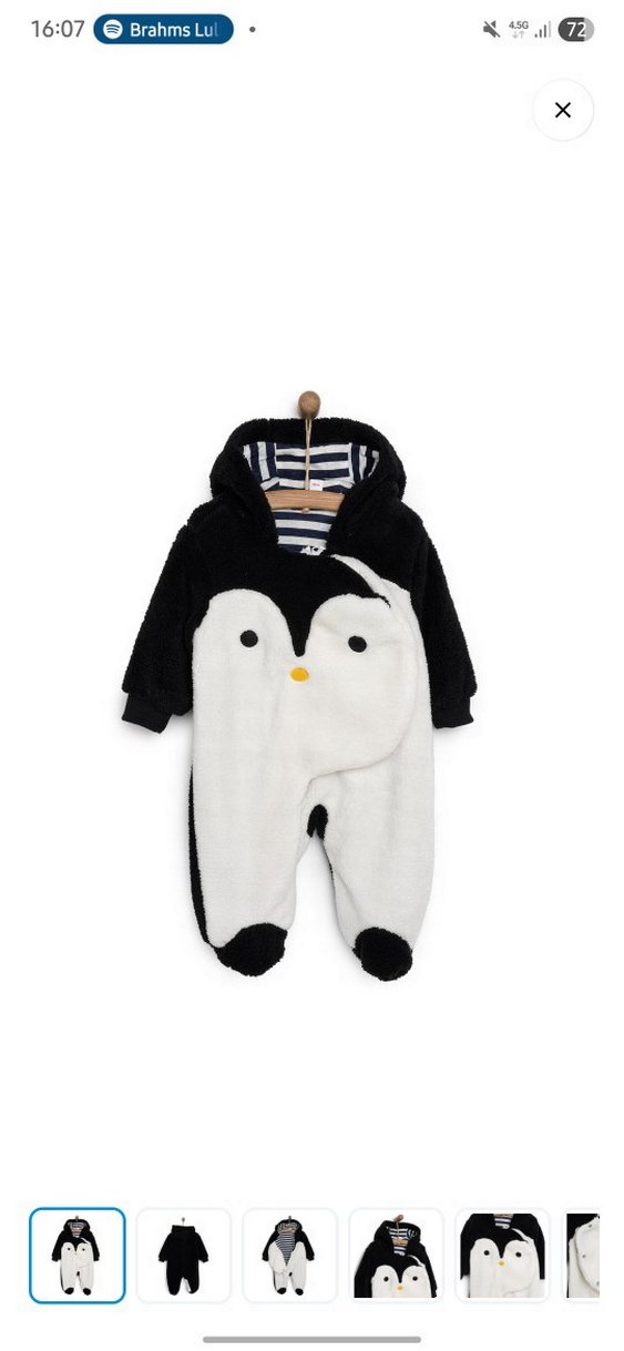 Kapüşonlu ve yumuşak kürk detaylı, siyah beyaz penguen desenli bebek tulumu. Bebekler için sıcak ve rahat bir seçenek. etiketli sıfır ürün.
