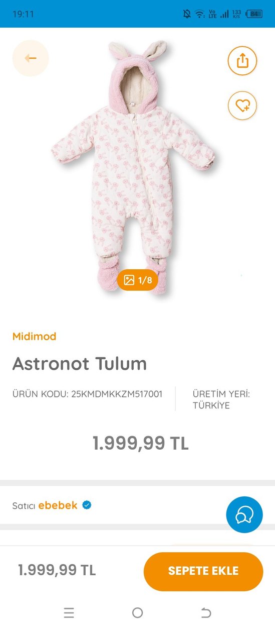 e bebekten yeni aldım denemeden aldığım için kızıma küçük geldi hiç giyilmedi sadece etiketini söktüm Pastel pembe renkli, desenli bebek astronot tulumu, yuvarlak yakalıdır. Türkiye'de Midimod tarafından üretilmiştir. 12-18 aylık