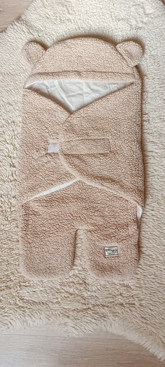 Bej renkte, yumuşak ve sıcak kumaştan yapılmış, peluş bebek kundak tulumu, çok iyi durumda desensiz . Çocuklar için rahat bir kullanım sağlar.