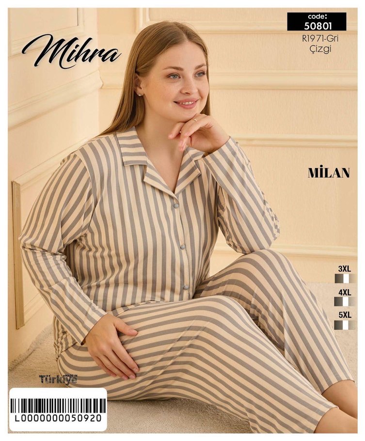Mihra kadın pijama takımı, uzun kollu ve uzun paça kesimiyle rahat bir kullanım sunar. Bej ve gri çizgili deseniyle konforlu ve sade bir stil sağlar. ️