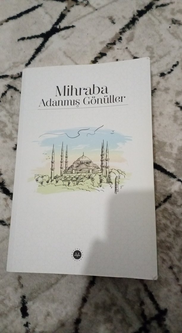 "Mihraba Adanmış Gönüller" adlı kitap, üzerinde cami ve kuş çizimi bulunan sade bir kapak tasarımına sahiptir.