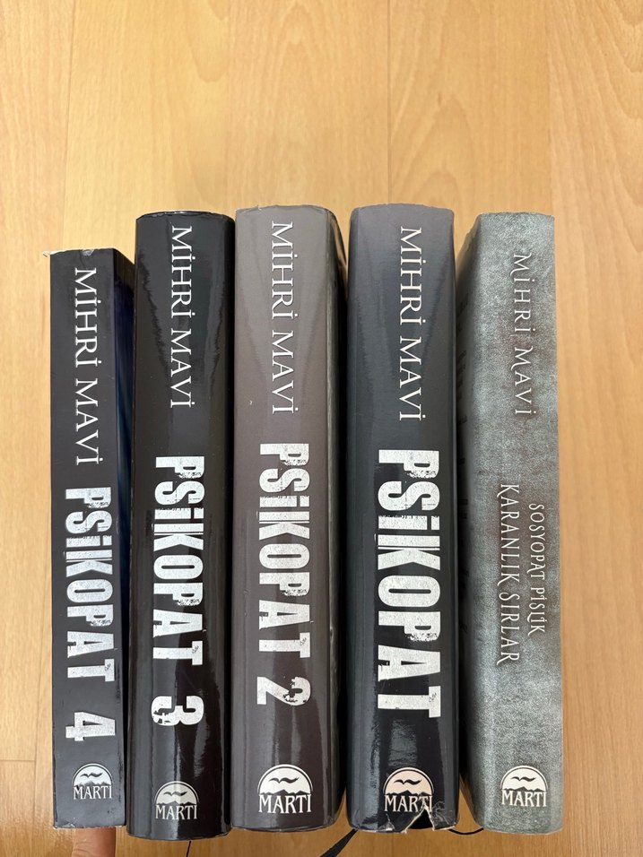 Mihri Mavi'nin Psikopat 1'den 4'e ve Sosyopat Pisuk Karanlık Sırlar kitaplarını içeren afişleri çıkartmaları ayraçları var