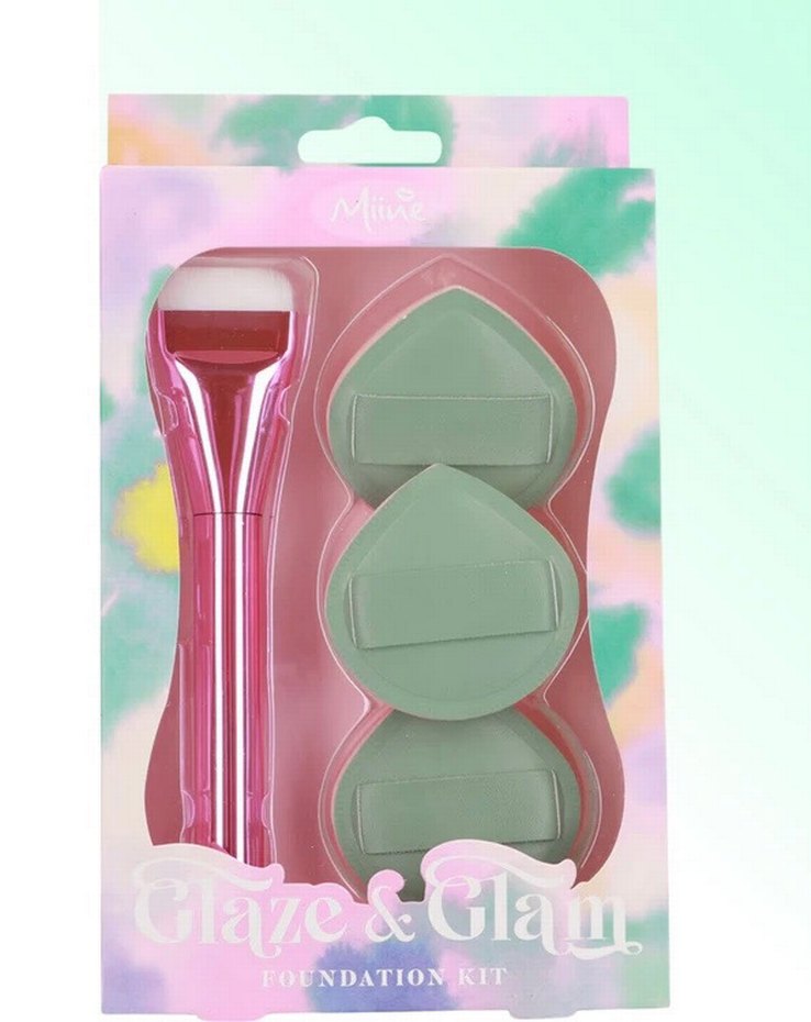 Miine Glaze & Glam fondöten seti, pembe ince uçlu fondöten fırçası ve pastel yeşil üç makyaj süngeri içerir, kolay uygulama için tutacaklıdır. Süngerler küçük değil cushion süngerleri kadar var ve ince değil puf sünger. Lütfen ilanları sepette birleştirmeyin