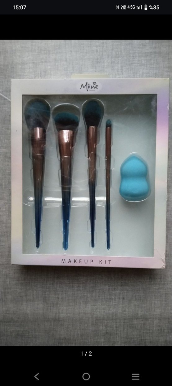 Miine markasına ait koyu mavi renkli dört makyaj fırçası ve makyaj süngeri içeren makyaj seti. ️