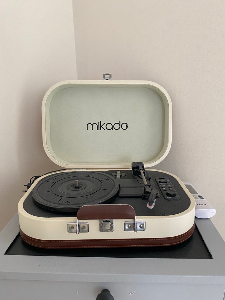 Mikado marka beyaz renkli taşınabilir plak çalar, kahverengi detaylara sahip ve entegre ton kolu ile kontroller içerir. Plaklar hedıyedır son fıyattır