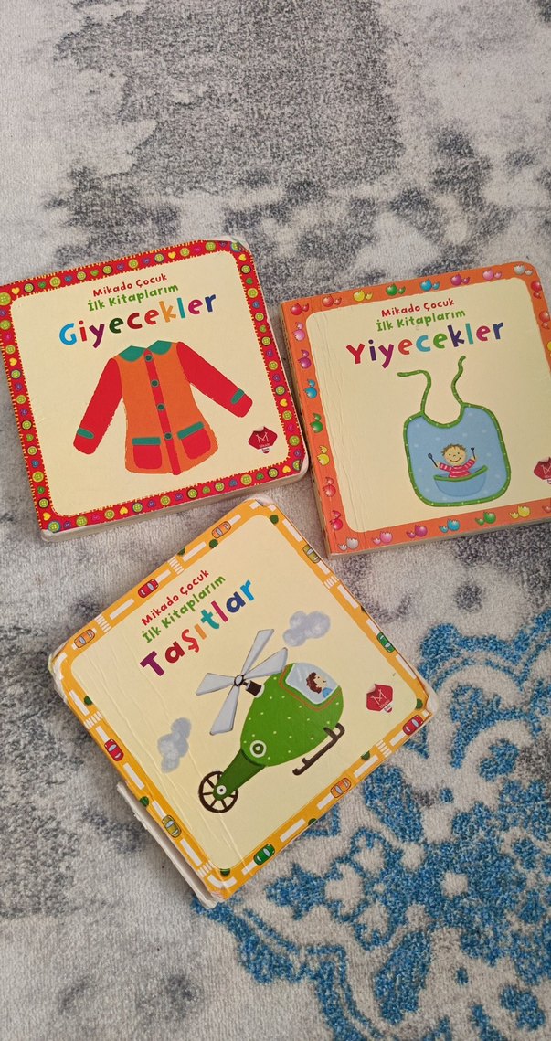 Mikado Çocuk İlk Kitaplar serisinden Giyecekler, Yiyecekler ve Taşıtlar kitaplarını içeren çocuk kitapları seti.
