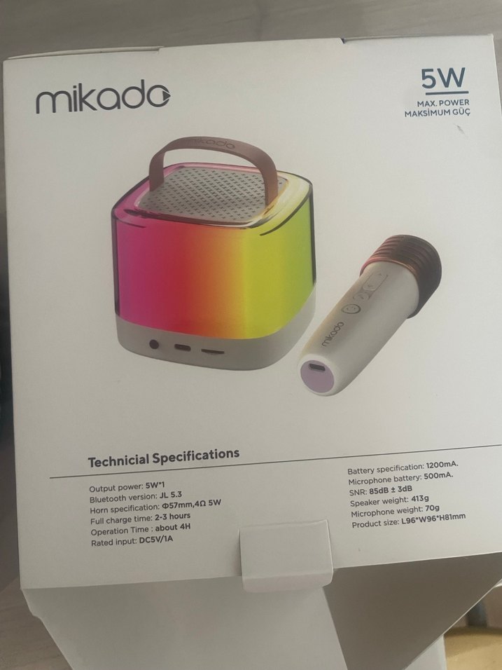 Mikado renkli Bluetooth hoparlör 5W maksimum güç sağlar, 1200mAh bataryaya sahiptir ve kablosuz mikrofon içerir. Bluetooth 5.3 destekler, 2-3 saat çalma süresi sunar.