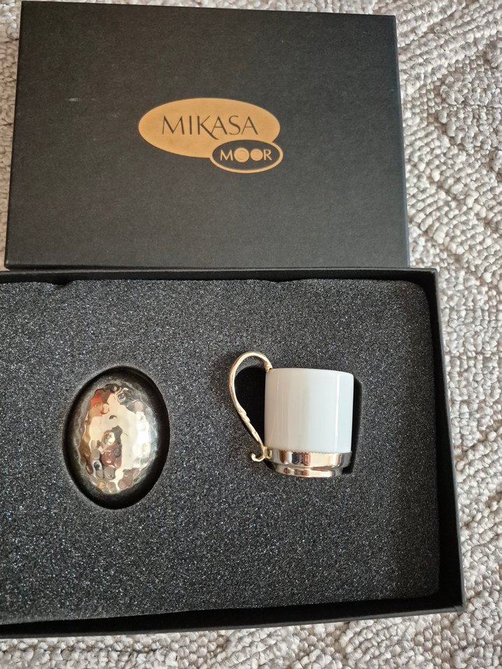 Mikasa Moor marka, baskılı beyaz mini fincan ve dokulu gümüş renkli yumurta şeklinde aksesuar seti. Koleksiyon için uygun. ☕ lokum kulpu düşmüş kutu içinde olacak alacak kişi tamir ettirebilir