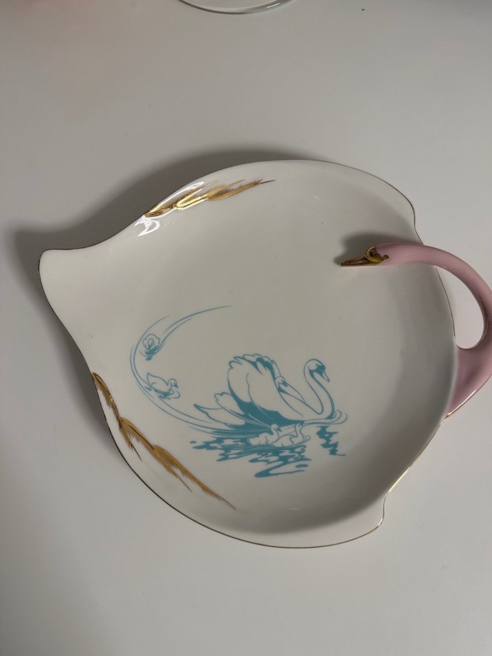 Beyaz renkte, pembe kulplu, kuğu desenli ve altın detaylı pastel tabak 6 lı