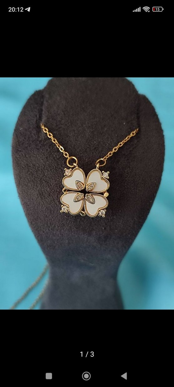 Altın renkli kolye, dört kalp şeklinde detaylı uçlarla iki farklı şekilde sade ve bohem tarzda günlük kullanım için uygun.