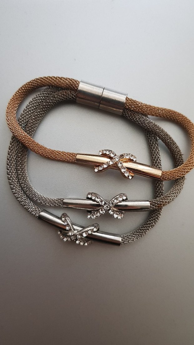 Gri zincir detaylı, yılan desenli ve taşlı fiyonk süslemeli kadın bileklikler, günlük kullanıma uygundur. ✨