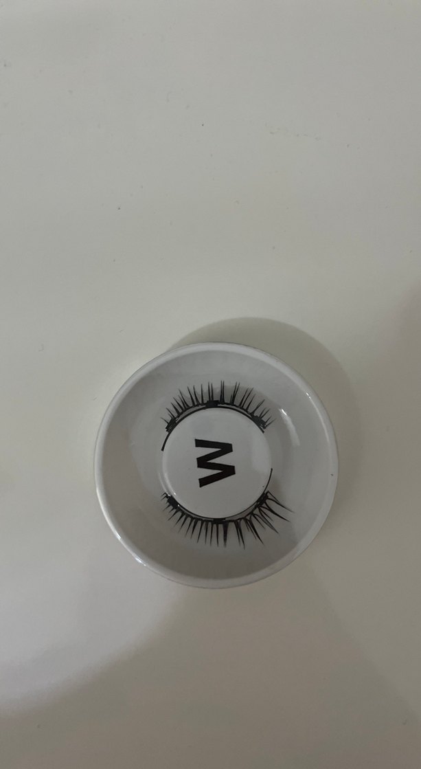 Beyaz yuvarlak kutuda, üzerinde 'W' harfi bulunan gri takma kirpikler. Göz görünümünü artırmak için uygundur. ️