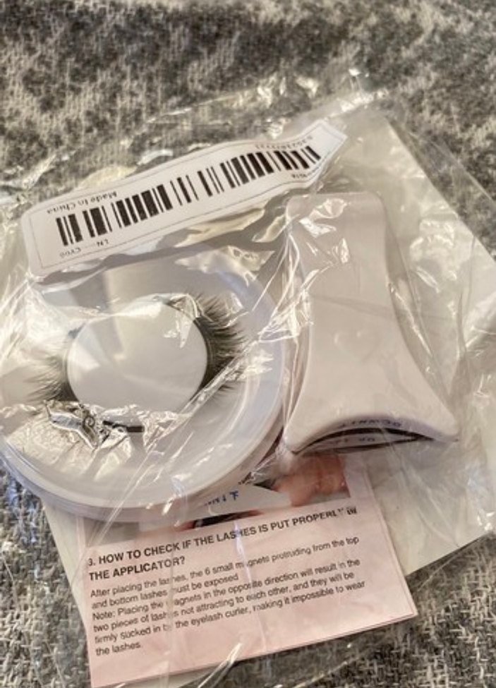 takma kirpikler, beyaz aplikatör ve kavisli beyaz tutucudan oluşan set, şeffaf ambalajda.
