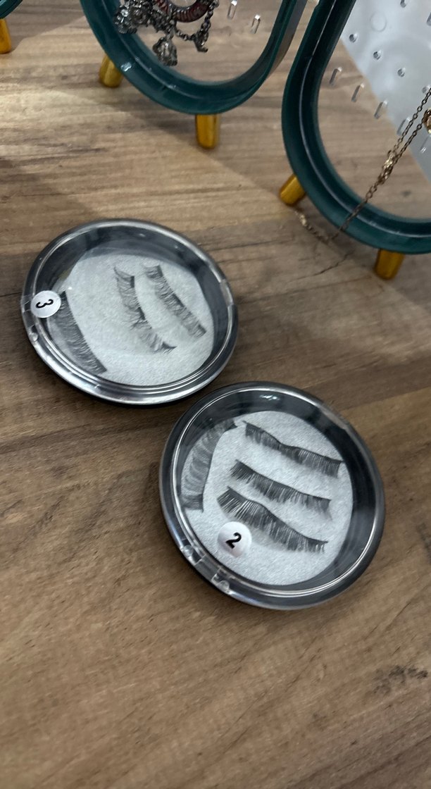 farklı stillerde yuvarlak kutularda takma kirpik seti.