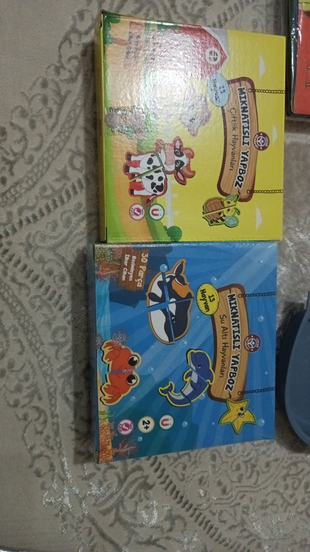 2 yaş ve üzeri çocuklar için çiftlik ve su altı temalı mıknatıslı yapboz setleri, her biri 30 parçadan oluşuyor.