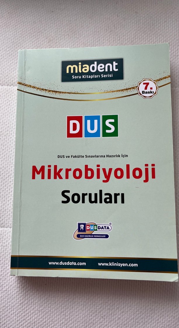 Miadent soru kitapları serisine ait, DUS ve fakülte sınavlarına hazırlık için mikrobiyoloji sorularını içeren 7. baskı kitap. İlk 70 sayfa çözülü