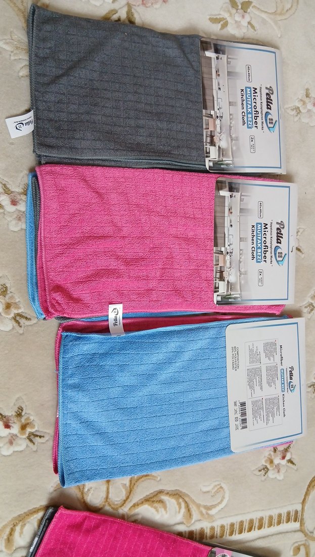 Gri, pembe ve mavi renklerde, desensiz, yumuşak mikrofiber kumaştan üretilmiş 3'lü mutfak bezi seti. Tekli fiyat 200, üçlü fiyat 280 TL.