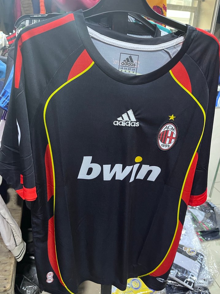 Adidas siyah AC Milan forması, kısa kollu ve dar kesimdir. Baskılı detaylar, velcro özellik ve sentetik kumaş kullanılmıştır. Sportif sokak tarzı için uygundur. ⚽ m beden