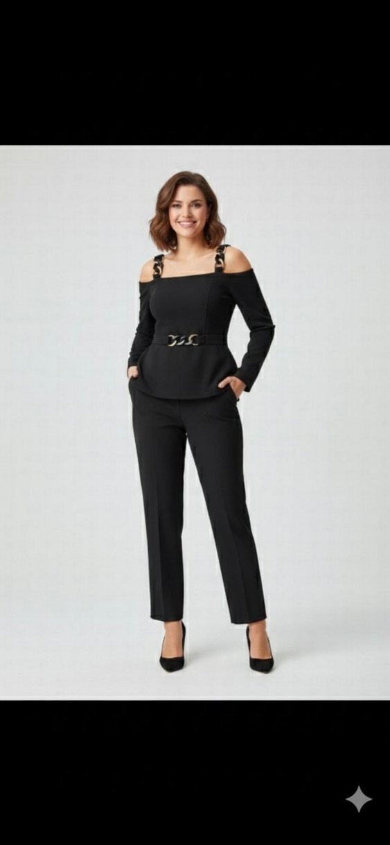 Siyah renkli, kayışlı ve straplez yakalı kadın takımı. Regular kesim ve midi boyda, sentetik kumaştan üretilmiştir. Ofis için uygundur.