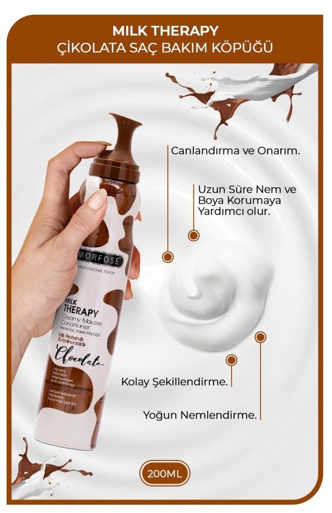 Milk Therapy Çikolata Saç Bakım Köpüğü, yoğun nemlendirme sağlar, canlandırma ve onarım yapar, kolay şekillendirme sunar. Uzun süre nem ve renk korur. Sütlü olanı ile aynı performansta. Çikolata kokusu bana hitap etmediği için satıyorum. Ürünü birkaç kez kullandım şişeyi tuttuğunuzda doluluğundan anlayabilirsiniz. Kullanmaya devam etmiyorum.