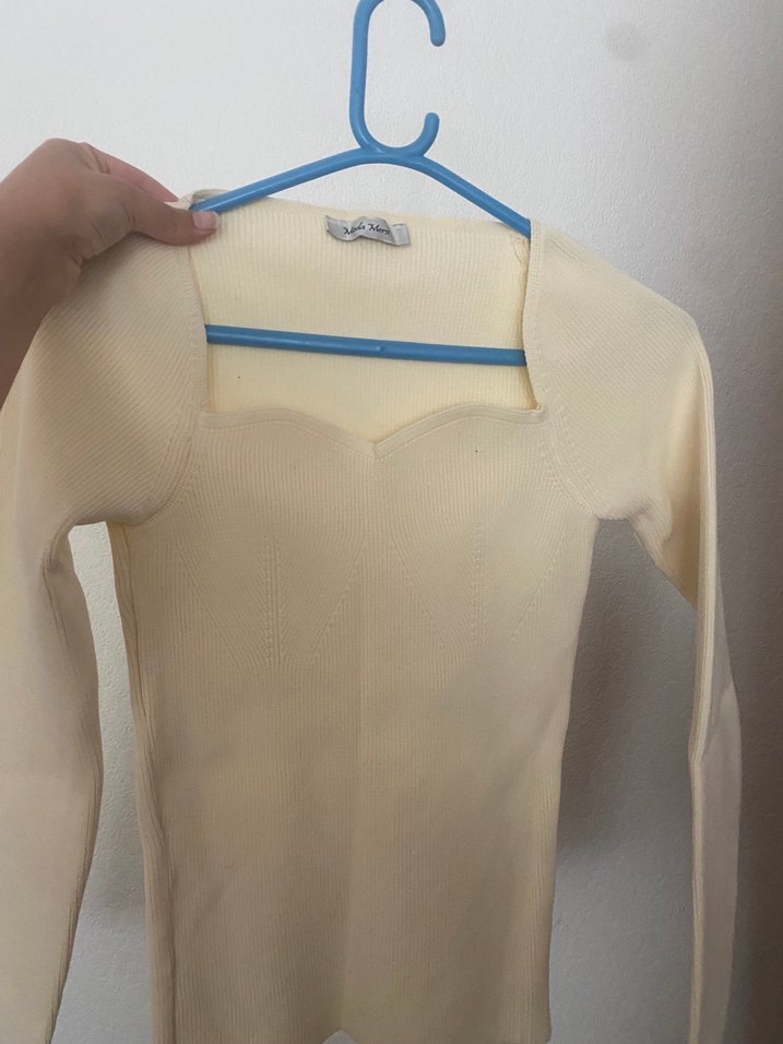 Pamuklu, uzun kollu, V yakalı, beyaz renkli, ince örme, normal midi boyda, günlük kullanıma uygun kadın triko kazak. Temiz deformesiz