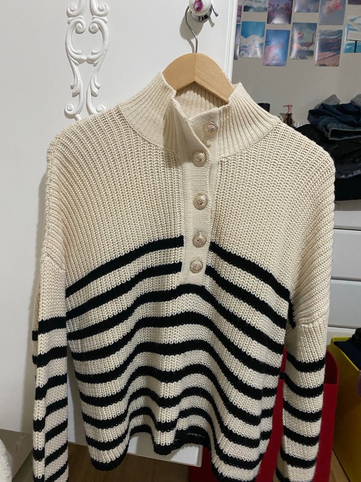 Düğmeli yüksek yakalı, uzun kollu, bol kesim kadın triko kazak. Beyaz ve gri çizgili örgü dokusuyla rahat ve günlük kullanım için uygun.