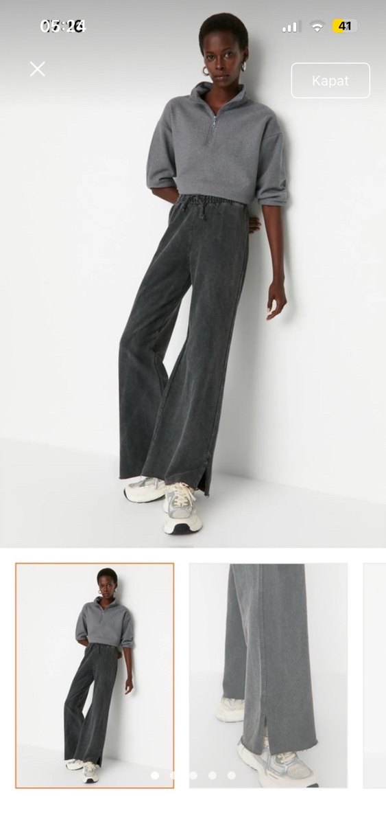 Gri batik desenli, rahat kesim kadın kot eşofman, midi boy ve yan yırtmaç detaylı. Günlük kullanım için uygun şık tasarım.