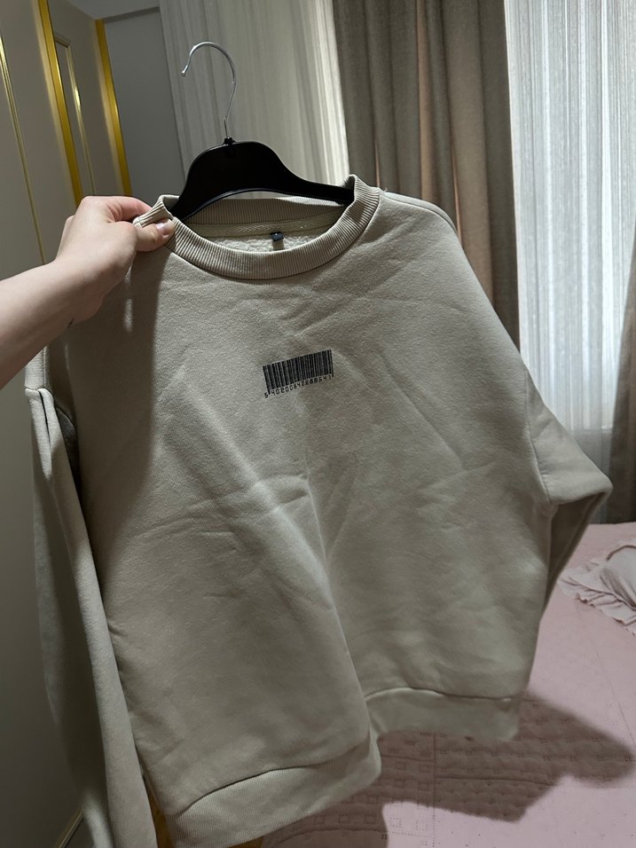 Bej renkli, oversize kesim kadın sweatshirt, yuvarlak yaka ve uzun kolludur. Yumuşak kumaştan üretilmiş, önünde küçük barkod desen bulunur. Günlük kullanıma uygundur.
