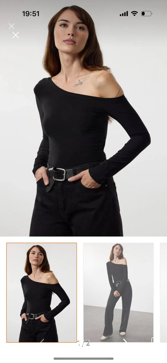 Dar kesim siyah deri bluz, tek omuz açık tekne yakalı ve uzun kolludur. Tokalı detayıyla günlük kullanıma uygundur. Sıfır etiketli üründür.✨