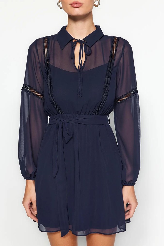 MİLLA Lacivert Yaka Detaylı Astarlı Şifon Dokuma Elbise