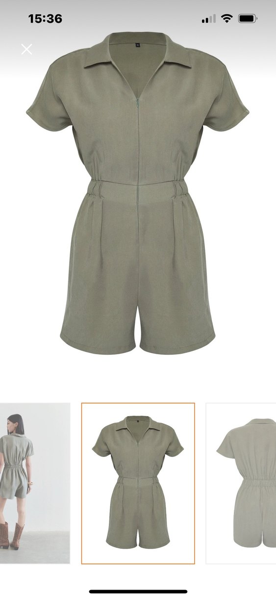 Kemerli, bol kesim kısa haki ne tulum, kısa kollu ve V yakalıdır. Fermuarı sayesinde dekoltesi dilediğiniz gibi ayarlanabilir. %92 viskoz %8 polyester kumaştan yapılmış, minimalist tarzda günlük kullanıma uygundur.