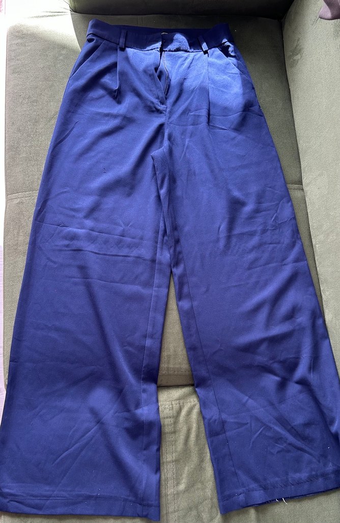 Mavi,, parlak görünümlü, bol kesim midi boy pantolon, ofis için sade ve şık tarzda. Bacak arasi ve paçalarda tulerme var, dugmesi koptu