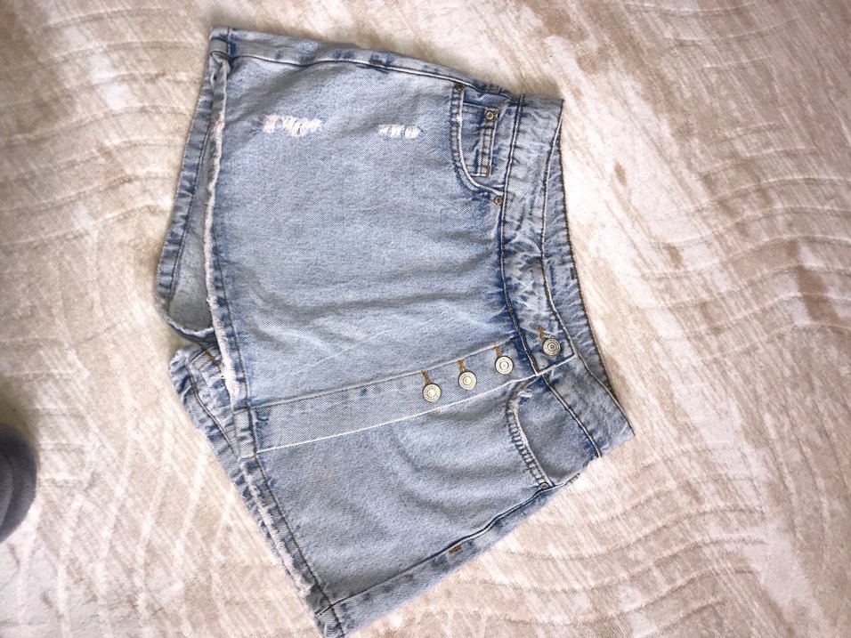 Düğmeli, bol kesim mavi mini kot şort. Pastel tonlarda, günlük ve sokak stili için uygundur. İki kere giyildi sadece bana dar geliryor