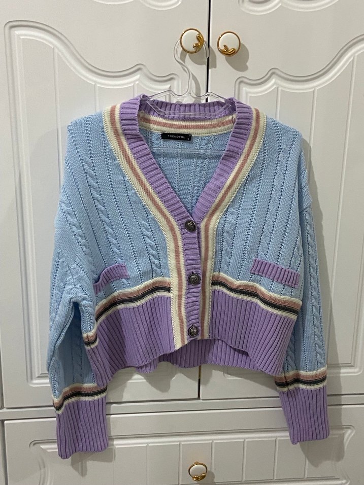 Birkaç kez giydim. Hala çok beğeniyorum fakat bir tık kısa benim için. V yaka, uzun kollu, bol kesim örgü hırka. Mor ve pastel tonlarda bağlama desenli, günlük rahat kullanıma uygun.