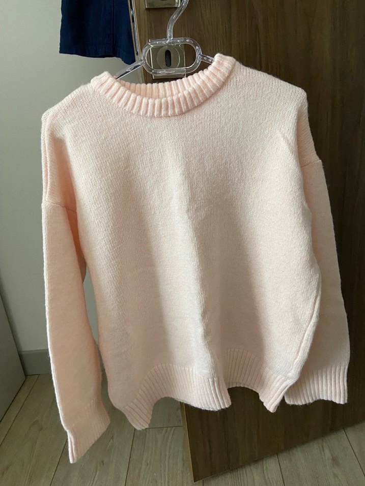 Pastel pembe renkte, yuvarlak yaka ve uzun kollu kadın kazak. Yumuşak örgü kumaştan, salaş kesim ve normal boyda, gündelik kullanım için uygun. Bir sorunu yoktur. Sayılı giyildi.