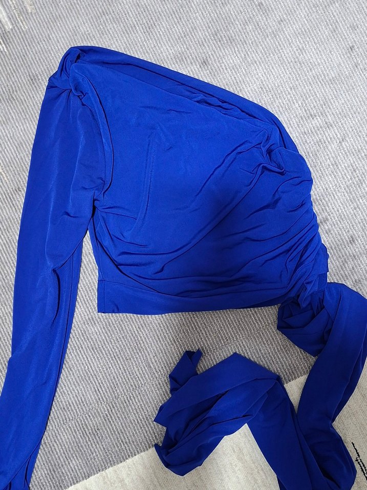 Milla saks mavisi baglamalı tek kol crop bluz