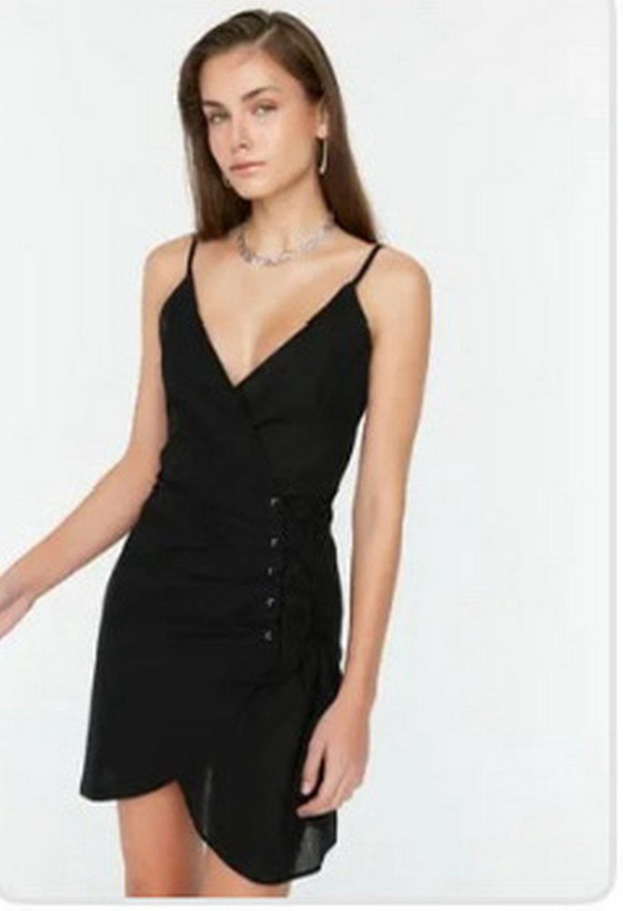 V yaka, ince askılı, siyah plaj elbisesi.Bağlama detaylıdır.