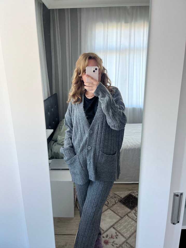 Gri renkli, örgü kumaştan yapılmış, rahat kesim, uzun kollu, çıtçıtlı ve notched lapel yakalı midi hırka ve pantolon. Günlük kullanıma göre uygundur. Milla önceki sezondan internette fiyatı 800 1 2 kez kullanıldı sorunsuz temiz ürün.
