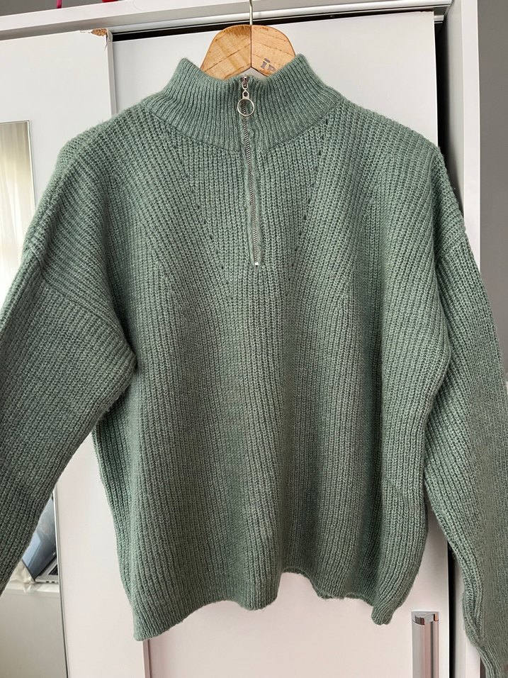 Yarım fermuarlı yüksek yakalı, uzun kollu, rahat kesim gri örgü kadın kazak. Günlük sokak stiline uygun. Yeni hiç kullanılmadı sitesinde 500 tl kalıbı Oversize bu arada Lye kadar olur.