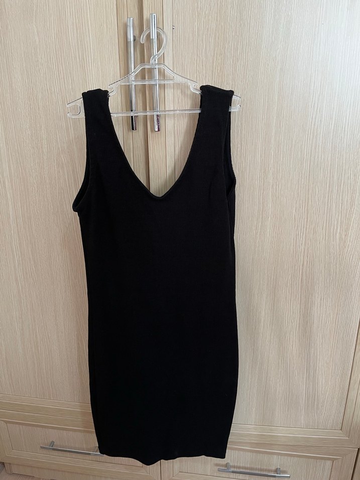 V yaka ve kolsuz tasarıma sahip siyah, vücuda oturan midi elbise, minimalist ve şık gotik tarzıyla günlük kullanıma uygundur.