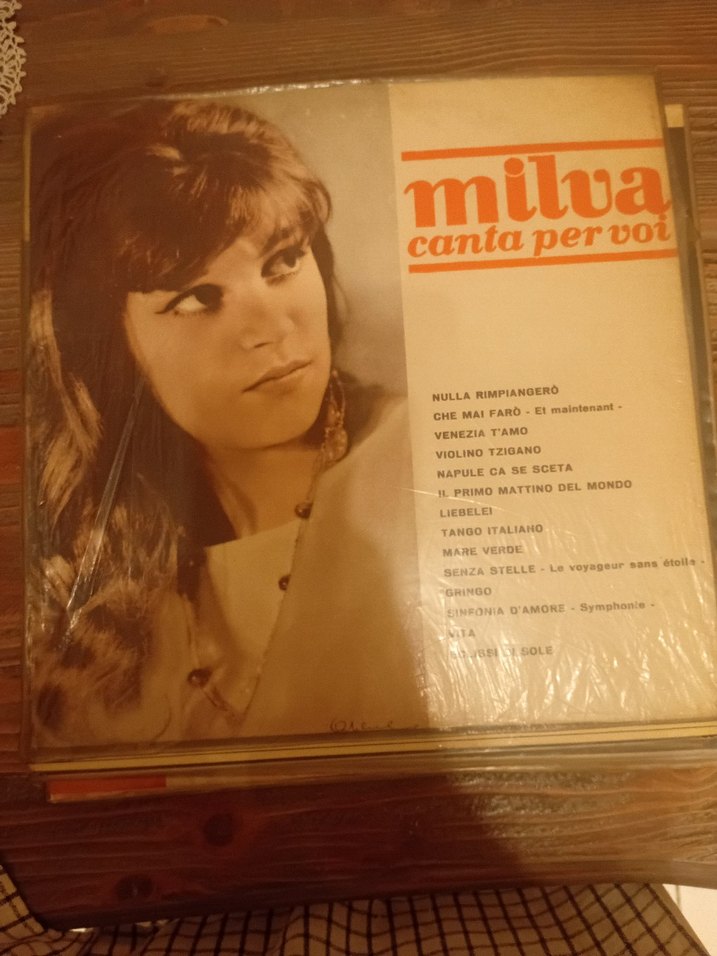 Milva'nın "Canta Per Voi" adlı LP albümü, klasik İtalyan şarkılarını içerir ve kapakta Milva'nın portresi yer alır.