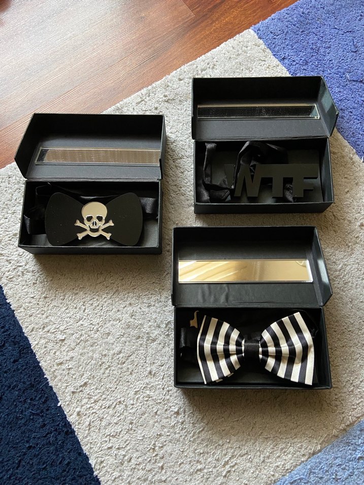 Siyah renkli, gotik ve punk tarzı desenlere sahip üçlü erkek papyon seti, kafatası baskılı, çizgili ve büyük harfli modeller içerir.