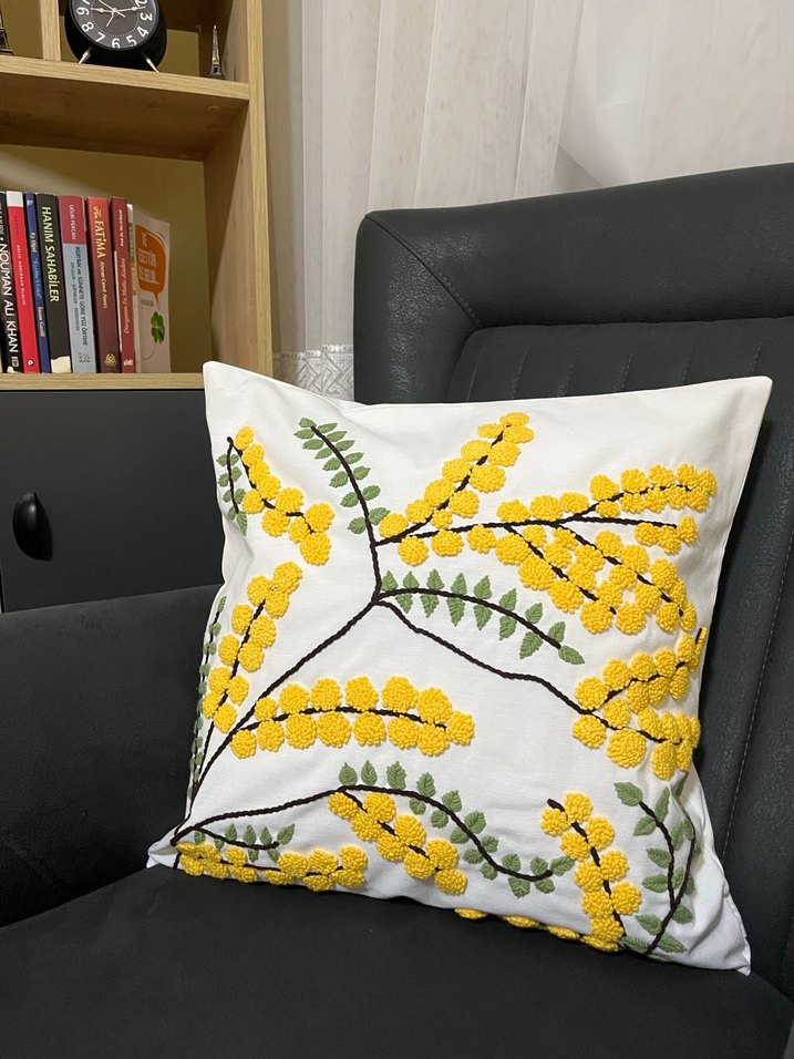 Yumuşak kumaş üzerine sarı nakışlı çiçek desenleriyle bohem tarzda renkli dekoratif yastık. tek veya çoğul sipariş edilebilinir. yıkanabilir modeldir istenilen model ve renkte özel siparişler hazırlanır.