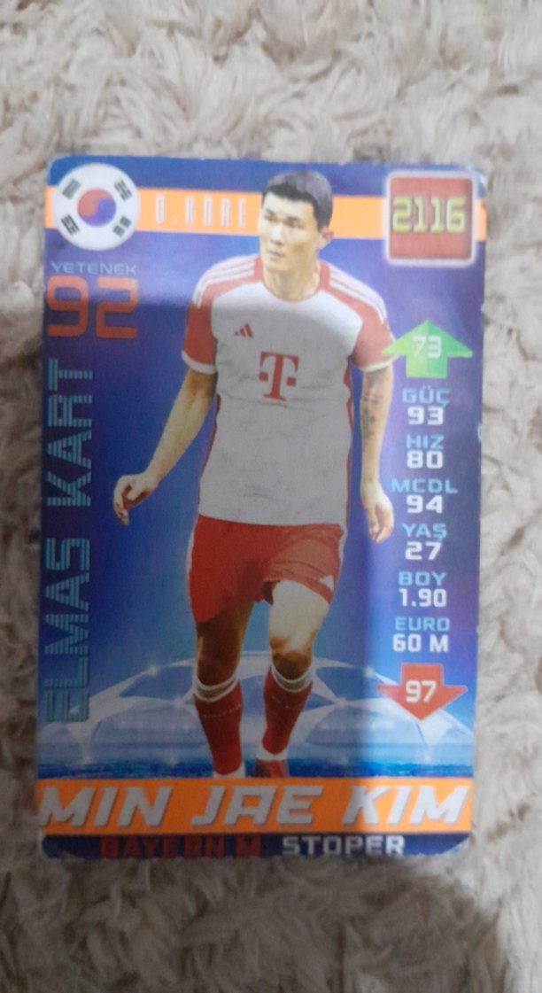 Kırmızı beyaz forma giymiş Min Jae Kim futbolcu figürü. Boyu 1.90 m, yaşı 27, oyuncu istatistikleri yer alır. ⚽
