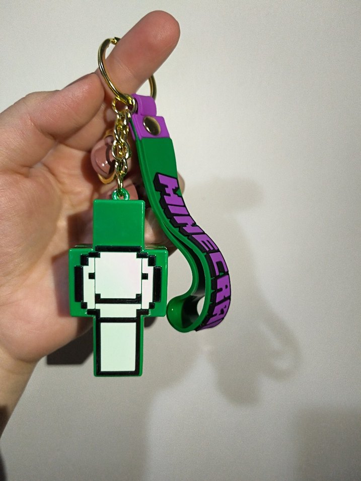 Zincir detaylı, renkli yeşil Minecraft temalı piksel tasarımlı anahtarlık ve üzerinde Minecraft yazılı mor kayış.