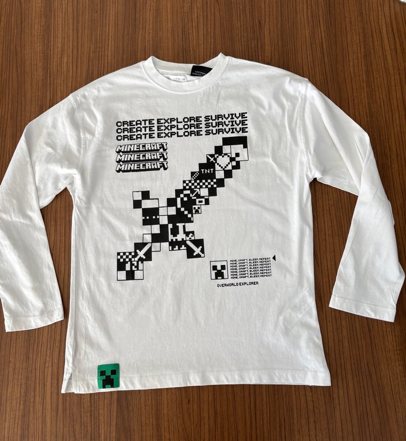 Pamuklu, beyaz renkli uzun kollu erkek çocuk tişörtü, Minecraft baskılı ve rahat kesimli, crew neck yakalıdır.